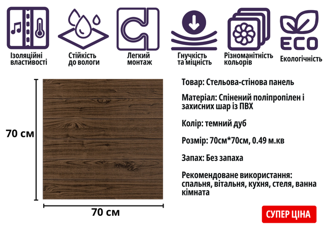 Додайте тепла й елегантності вашому інтер’єру за допомогою самоклеючої 3D панелі під темний дуб. Вишуканий дерев'яний візерунок та текстура натурального дерева перетворюють будь-яку кімнату на стильний та затишний простір. Монтаж максимально простий: без клею, інструментів і бруду. Ідеально підходить для оформлення вітальні, спальні, кухні, офісу або коридору.